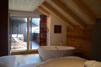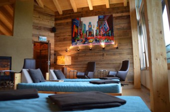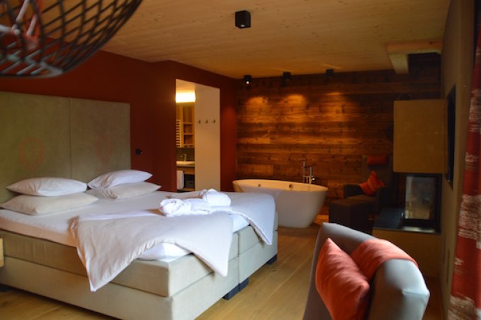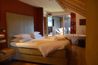 Wir haben eine der sieben neuen „lebe frei-Suiten“ im 4. Stock bezogen. Die geschmackvollen Suiten haben eine Größe von ca. 63 m2. Unsere bietet mit einer Privat-Sauna, offenem Kamin, freistehender Badewanne, bequemen Boxspringbett, zwei großen Fernsehern, eigenem Zimmerbrunnen mit Granderwasser, begehbarem Kleiderschrank mit reichlich Abstellfläche und zwei eigenen Dachterassen mit Bergblick großzügig Platz. Da kann ma wirklich „frei-leben“. Die geräumigen Zimmer im 3. Stock wurden auch bereits neu gestaltet.