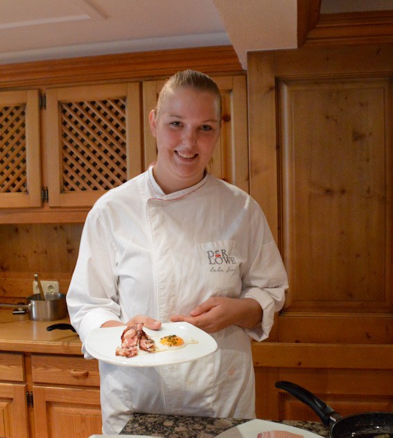 Dort kreiert der Küchenchef Albert Dschulnigg täglich ein 5 Gänge-Gourmetmenü mit „Köstlichkeiten der Berge“ Es wird grosser Wert auf regionale Produkte gelegt, z.B. Qualitätsfleisch von Regionalen Bauern. Beim Hauptgang hat man die Wahl zwischen 3 Gerichten, wobei eins davon vegetarisch ist. Während des Aufenthalts hat man einen festen Platz im Restaurant, bei schönem Wetter kann man aber auch draußen auf der idyllischen Terrasse sitzen. Besonders gemütlich sind dort die drei Nischenplätze im Stil eines Heurigenlokals.