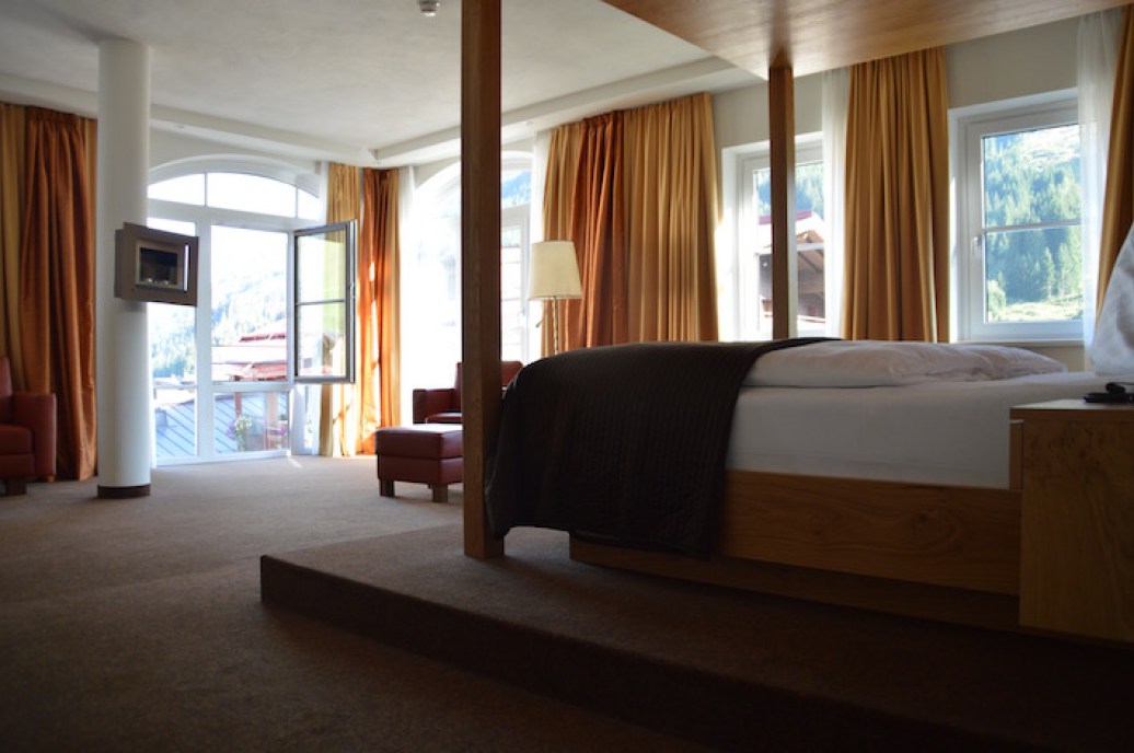Wir hatten eine der drei neuen, großzügigen Turm-Suiten deluxe. Ein sehr geräumiger Raum von ca. 70 m2 mit Balkon, Schlafzimmer mit King Size Bett in Himmelbettform, begehbarem Kleiderschrank und Wohnteil mit Sitzbar und Couch. Das Badezimmer mit Lichttherapielampe hatte noch eine Doppelbadewanne und eine begehbare Regendusche mit Sitzbank. Alles sehr modern und klassisch schön. Zudem sehr sauber. Im 3. Stock hatten wir durch die große Glasfront einen wunderbaren Blick auf die umliegende Bergwelt. Eine kleine persönliche Begrüßung im Zimmer z.B. ein Krug mit dem leckeren Bergquellwasser, hätte das Arrangement perfektioniert.
