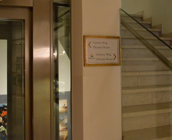 Gut gefallen haben uns auch die kleinen Details, die uns zum Schmunzeln gebracht haben. Erwähnenswert ist z.B. das Schild zwischen Lift und Treppenaufgang,