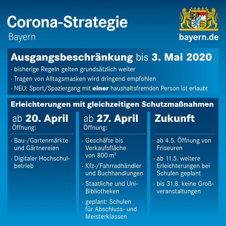 Seit Samstag, 21.03.2020 – 03.05.2020, gelten in Bayern Ausgangsbeschränkungen.